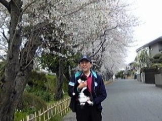 選挙投票に向かう途中、桜並木の下で花見をしている“タキちゃん”に出会った。私たちの姿を見つけると、小走りに駆け寄ってきては足にまとわりつく。まるで、「一緒にお花見をしようよ~!」とでも言いたげな素振りをする。立ち居振る舞いが限りなく人間に近いタキちゃんは町内きっての人気者。せっかくだから、しばらくの間、満開の桜を堪能させてもらうことに。しかし、数日来の強風の影響によるものか、早くも桜は散り始めている模様だ。写真はタキちゃんを抱っこしているところを撮ったつもりだが、そのようには見えないかもしれない。